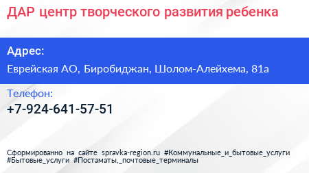 ДАР, центр творческого развития ребенка по адресу Еврейская АО, Биробиджан, Шолом-Алейхема, 81а в дальнейшем Организация, размещена в следующих категориях: