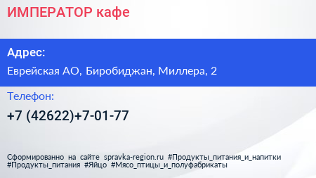 ИМПЕРАТОР, кафе по адресу Еврейская АО, Биробиджан, Миллера, 2 в дальнейшем Организация, размещена в следующих категориях:
