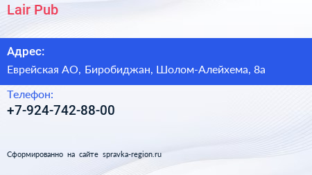 Lair Pub по адресу Еврейская АО, Биробиджан, Шолом-Алейхема, 8а в дальнейшем Организация, размещена в следующих категориях: