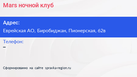 Mars, ночной клуб по адресу Еврейская АО, Биробиджан, Пионерская, 62в в дальнейшем Организация, размещена в следующих категориях:
