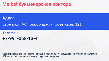 Melbet, букмекерская контора по адресу Еврейская АО, Биробиджан, Советская, 121 в дальнейшем Организация, размещена в следующих категориях: