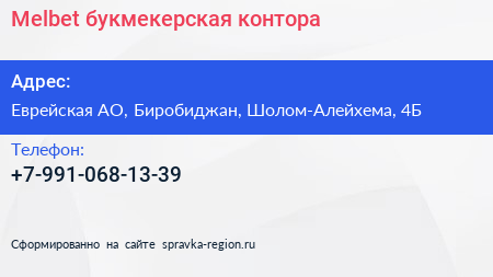 Melbet, букмекерская контора по адресу Еврейская АО, Биробиджан, Шолом-Алейхема, 4Б в дальнейшем Организация, размещена в следующих категориях: