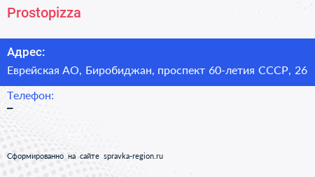 Prostopizza по адресу Еврейская АО, Биробиджан, проспект 60-летия СССР, 26 в дальнейшем Организация, размещена в следующих категориях:
