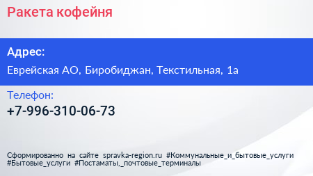 Ракета, кофейня по адресу Еврейская АО, Биробиджан, Текстильная, 1а в дальнейшем Организация, размещена в следующих категориях: