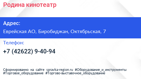 Родина, кинотеатр по адресу Еврейская АО, Биробиджан, Октябрьская, 7 в дальнейшем Организация, размещена в следующих категориях: