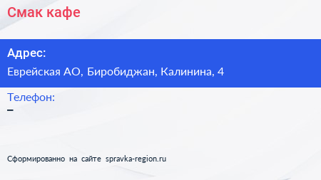 Смак, кафе по адресу Еврейская АО, Биробиджан, Калинина, 4 в дальнейшем Организация, размещена в следующих категориях: