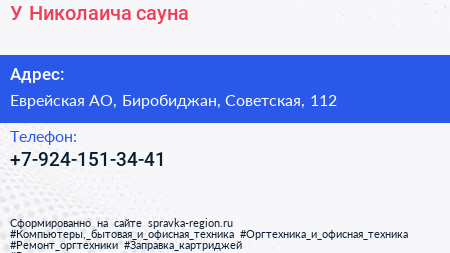У Николаича, сауна по адресу Еврейская АО, Биробиджан, Советская, 112 в дальнейшем Организация, размещена в следующих категориях: