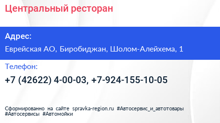 Центральный, ресторан по адресу Еврейская АО, Биробиджан, Шолом-Алейхема, 1 в дальнейшем Организация, размещена в следующих категориях: