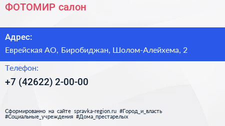 ФОТОМИР, салон по адресу Еврейская АО, Биробиджан, Шолом-Алейхема, 2 в дальнейшем Организация, размещена в следующих категориях: