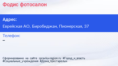 Фодис, фотосалон по адресу Еврейская АО, Биробиджан, Пионерская, 37 в дальнейшем Организация, размещена в следующих категориях: