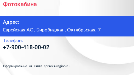 Фотокабина по адресу Еврейская АО, Биробиджан, Октябрьская, 7 в дальнейшем Организация, размещена в следующих категориях: