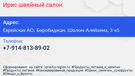 Ирис, швейный салон по адресу Еврейская АО, Биробиджан, Шолом-Алейхема, 3 к5 в дальнейшем Организация, размещена в следующих категориях: