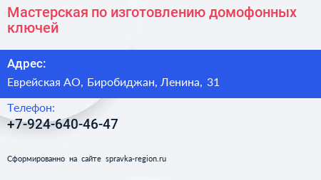 Мастерская по изготовлению домофонных ключей по адресу Еврейская АО, Биробиджан, Ленина, 31 в дальнейшем Организация, размещена в следующих категориях: