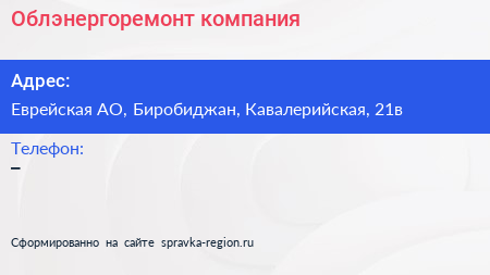 Облэнергоремонт, компания по адресу Еврейская АО, Биробиджан, Кавалерийская, 21в в дальнейшем Организация, размещена в следующих категориях: