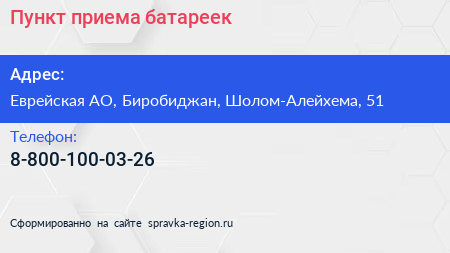 Пункт приема батареек по адресу Еврейская АО, Биробиджан, Шолом-Алейхема, 51 в дальнейшем Организация, размещена в следующих категориях: