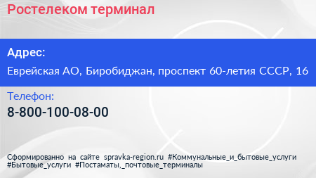 Ростелеком, терминал по адресу Еврейская АО, Биробиджан, проспект 60-летия СССР, 16 в дальнейшем Организация, размещена в следующих категориях: