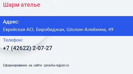 Шарм, ателье по адресу Еврейская АО, Биробиджан, Шолом-Алейхема, 49 в дальнейшем Организация, размещена в следующих категориях: