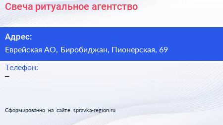 Свеча, ритуальное агентство по адресу Еврейская АО, Биробиджан, Пионерская, 69 в дальнейшем Организация, размещена в следующих категориях: