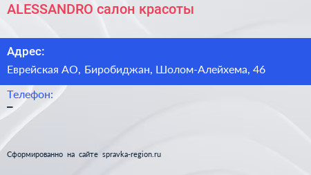 ALESSANDRO, салон красоты по адресу Еврейская АО, Биробиджан, Шолом-Алейхема, 46 в дальнейшем Организация, размещена в следующих категориях:
