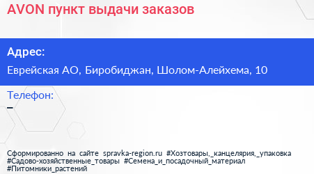 AVON, пункт выдачи заказов по адресу Еврейская АО, Биробиджан, Шолом-Алейхема, 10 в дальнейшем Организация, размещена в следующих категориях: