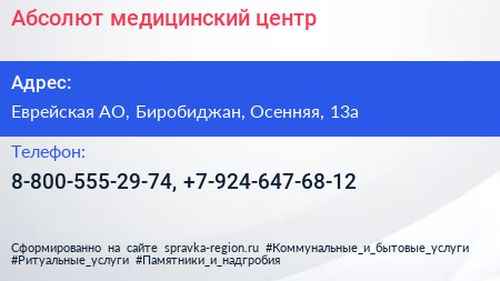 Абсолют, медицинский центр по адресу Еврейская АО, Биробиджан, Осенняя, 13а в дальнейшем Организация, размещена в следующих категориях: