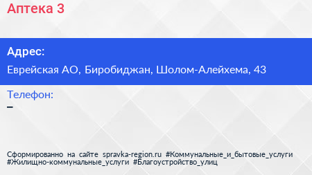 Аптека №3 по адресу Еврейская АО, Биробиджан, Шолом-Алейхема, 43 в дальнейшем Организация, размещена в следующих категориях: