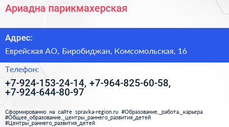 Ариадна, парикмахерская по адресу Еврейская АО, Биробиджан, Комсомольская, 16 в дальнейшем Организация, размещена в следующих категориях: