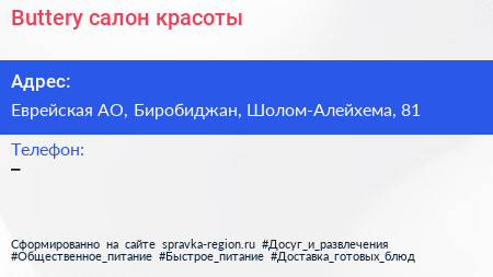 Buttery, салон красоты по адресу Еврейская АО, Биробиджан, Шолом-Алейхема, 81 в дальнейшем Организация, размещена в следующих категориях:
