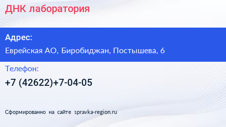 ДНК-лаборатория по адресу Еврейская АО, Биробиджан, Постышева, 6 в дальнейшем Организация, размещена в следующих категориях:
