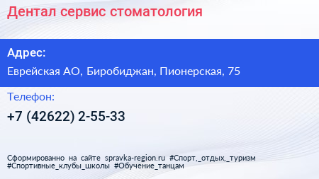 Дентал сервис, стоматология по адресу Еврейская АО, Биробиджан, Пионерская, 75 в дальнейшем Организация, размещена в следующих категориях:
