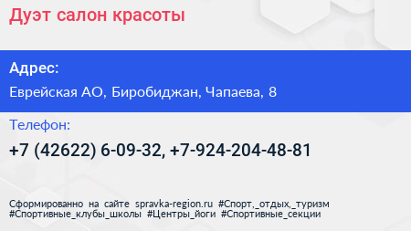 Дуэт, салон красоты по адресу Еврейская АО, Биробиджан, Чапаева, 8 в дальнейшем Организация, размещена в следующих категориях: