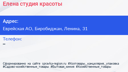 Елена, студия красоты по адресу Еврейская АО, Биробиджан, Ленина, 31 в дальнейшем Организация, размещена в следующих категориях: