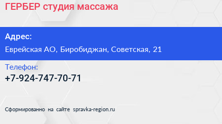 ГЕРБЕР, студия массажа по адресу Еврейская АО, Биробиджан, Советская, 21 в дальнейшем Организация, размещена в следующих категориях: