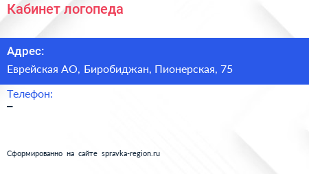 Кабинет логопеда по адресу Еврейская АО, Биробиджан, Пионерская, 75 в дальнейшем Организация, размещена в следующих категориях: