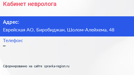 Кабинет невролога по адресу Еврейская АО, Биробиджан, Шолом-Алейхема, 48 в дальнейшем Организация, размещена в следующих категориях: