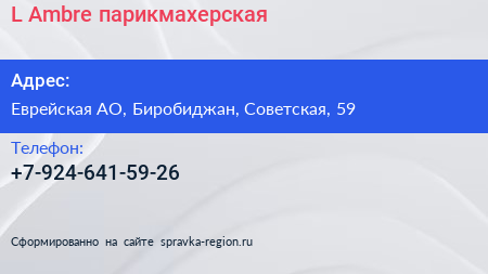 L`Ambre, парикмахерская по адресу Еврейская АО, Биробиджан, Советская, 59 в дальнейшем Организация, размещена в следующих категориях: