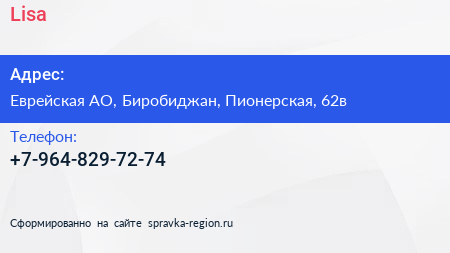 Lisa по адресу Еврейская АО, Биробиджан, Пионерская, 62в в дальнейшем Организация, размещена в следующих категориях: