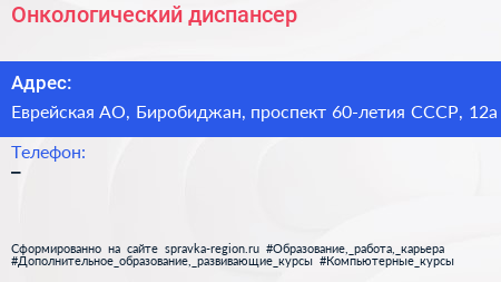 Онкологический диспансер по адресу Еврейская АО, Биробиджан, проспект 60-летия СССР, 12а в дальнейшем Организация, размещена в следующих категориях: