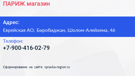 ПАРИЖ, магазин по адресу Еврейская АО, Биробиджан, Шолом-Алейхема, 46 в дальнейшем Организация, размещена в следующих категориях: