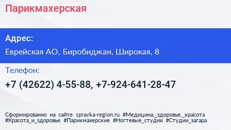 Парикмахерская по адресу Еврейская АО, Биробиджан, Широкая, 8 в дальнейшем Организация, размещена в следующих категориях: