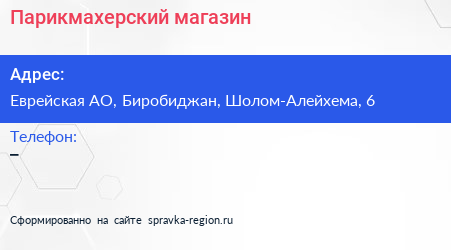 Парикмахерский магазин по адресу Еврейская АО, Биробиджан, Шолом-Алейхема, 6 в дальнейшем Организация, размещена в следующих категориях: