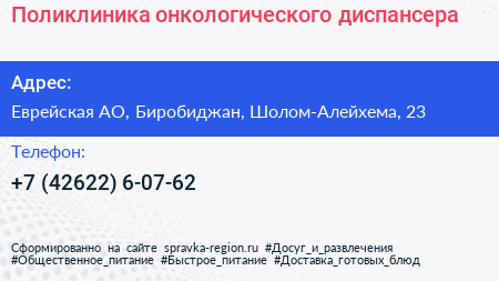 Поликлиника онкологического диспансера по адресу Еврейская АО, Биробиджан, Шолом-Алейхема, 23 в дальнейшем Организация, размещена в следующих категориях: