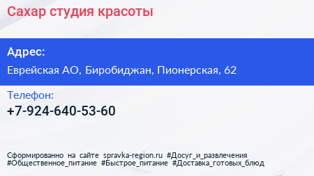 Сахар, студия красоты по адресу Еврейская АО, Биробиджан, Пионерская, 62 в дальнейшем Организация, размещена в следующих категориях: