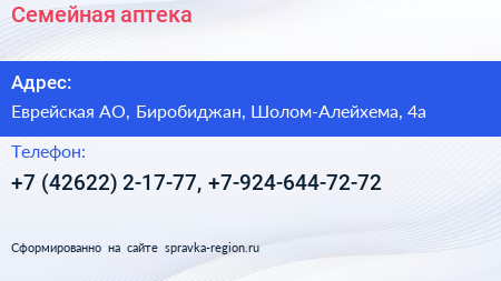 Семейная аптека по адресу Еврейская АО, Биробиджан, Шолом-Алейхема, 4а в дальнейшем Организация, размещена в следующих категориях: