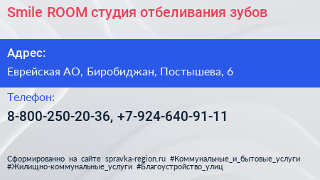 Smile ROOM, студия отбеливания зубов по адресу Еврейская АО, Биробиджан, Постышева, 6 в дальнейшем Организация, размещена в следующих категориях: