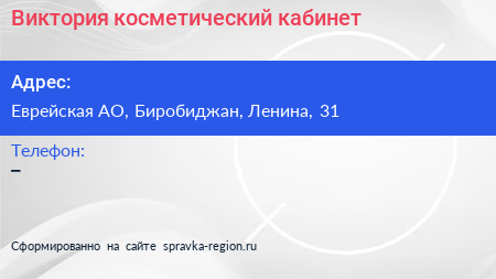 Виктория, косметический кабинет по адресу Еврейская АО, Биробиджан, Ленина, 31 в дальнейшем Организация, размещена в следующих категориях:
