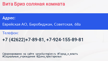 Вита Бриз, соляная комната по адресу Еврейская АО, Биробиджан, Советская, 68а в дальнейшем Организация, размещена в следующих категориях: