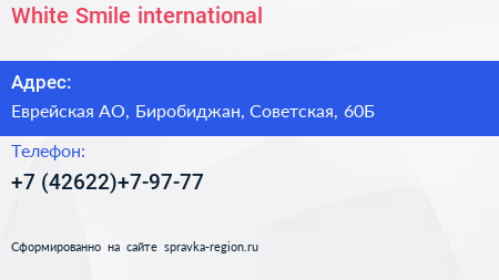 White & Smile international по адресу Еврейская АО, Биробиджан, Советская, 60Б в дальнейшем Организация, размещена в следующих категориях: