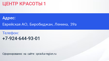 ЦЕНТР КРАСОТЫ №1 по адресу Еврейская АО, Биробиджан, Ленина, 39а в дальнейшем Организация, размещена в следующих категориях: