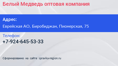 Белый Медведь, оптовая компания по адресу Еврейская АО, Биробиджан, Пионерская, 75 в дальнейшем Организация, размещена в следующих категориях: